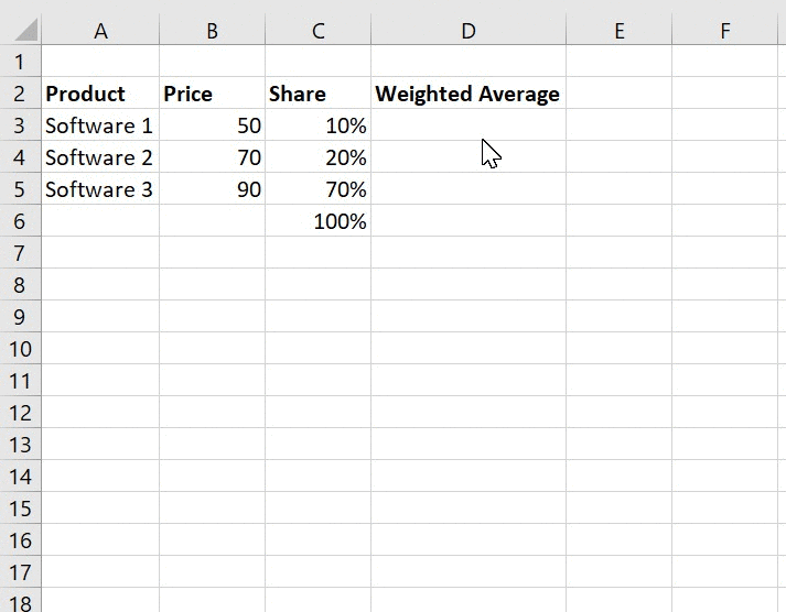 Suppose you have three software products with prices $50, $70 and $90, and their market shares are 10%, 20% and 70% respectively. The weighted average price would be calculated as follows: