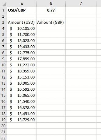 In such cases, we can use an Absolute Reference, by hitting the F4 button (or manually typing the $ signs before the column and/or row – not recommended) after typing the cell reference.