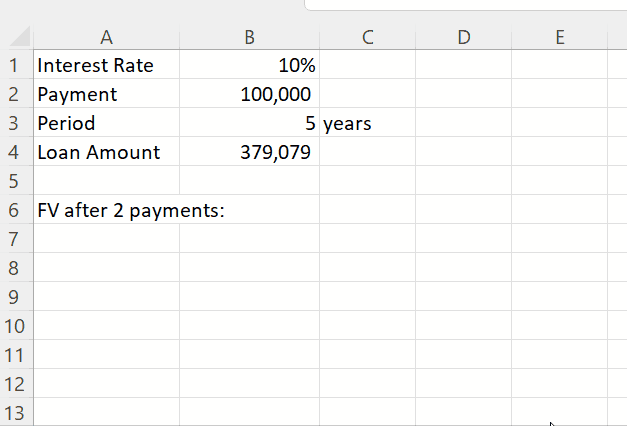 What is the FV (Future Value) of the loan after 2 payments? (In other words – How much loan is left after 2 payments were made?)