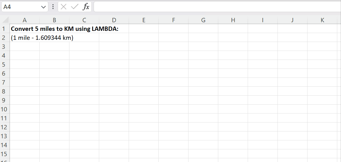 Let’s assume that we wanted to invent a function that converts miles to kilometers, instead of dividing by 1.609344 each time. We can do it using LAMBDA.