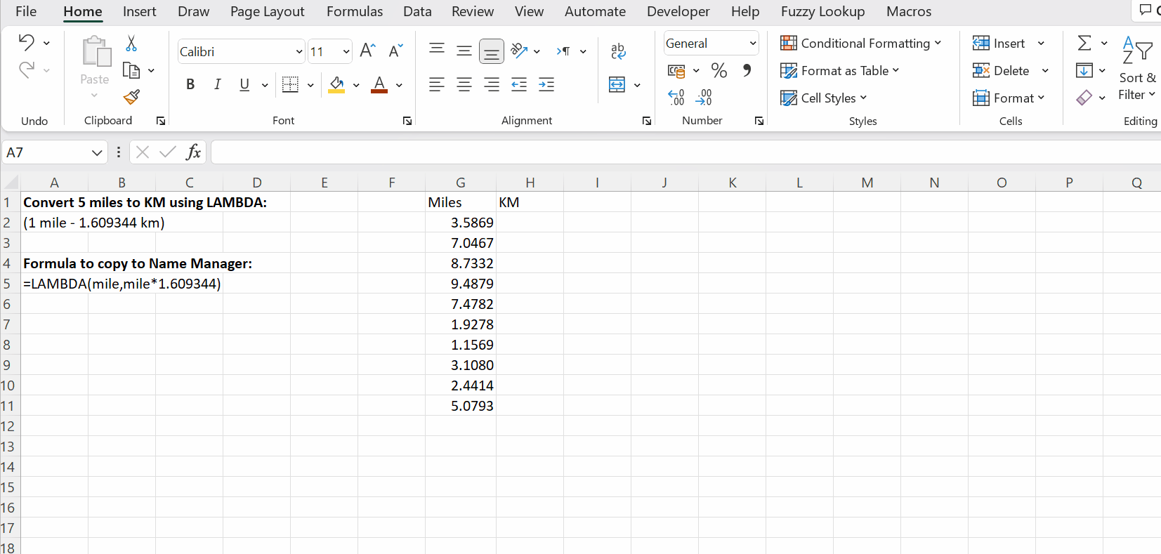 Nope. Not easy. Not yet. After seeing this example – you might ask yourself – Why on earth should I use LAMBDA at all?! It’s longer than just writing something like =A1*1.609344. And you will be correct. The true power of LAMBDA is unleashed when we take the function we wrote before, and store it as a new function within our workbook. Imagine that you could type something like this in Excel to find out how many kilometers are 5 miles…