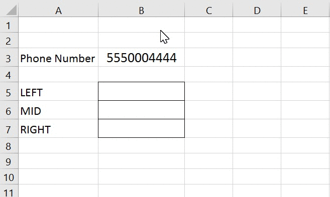 The last (but not least) function is MID, which is capable of extracting a specific amount of letters from the middle of the text. Its syntax is:
