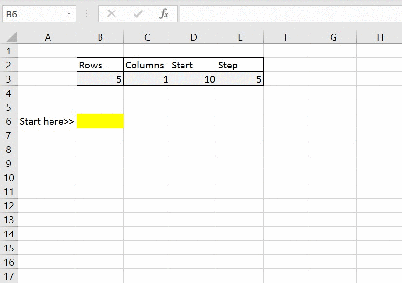 [columns] – How many columns will be in the range. This argument is optional. If left empty – only one column will be created. [start] – What value will be the starting value of the range. This argument is optional. If left empty – the starting number will be 1. [step] – What is the increment between each step. This argument is optional. If left empty – the step is 1.
