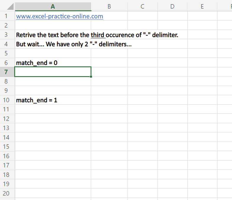 As you can see, there are only 2 “-” delimiters in the example above. When match_end is 0, we are not treating the end of the text as a delimiter, therefore we get an #N/A error – we can’t find the 3rd delimiter, so an error is returned.