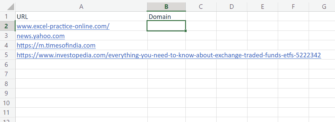 There is no function to get the text between delimiters, but we can create one, by combining TEXTBEFORE and TEXTAFTER. For example, let’s try to get the domain names of the following websites: