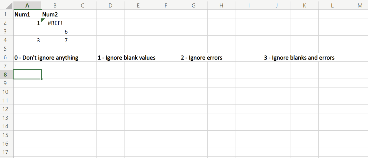 0 – Don’t ignore anything. In such case, the newly created column will contain errors from the original array, as well as blank values (represented as 0’s)