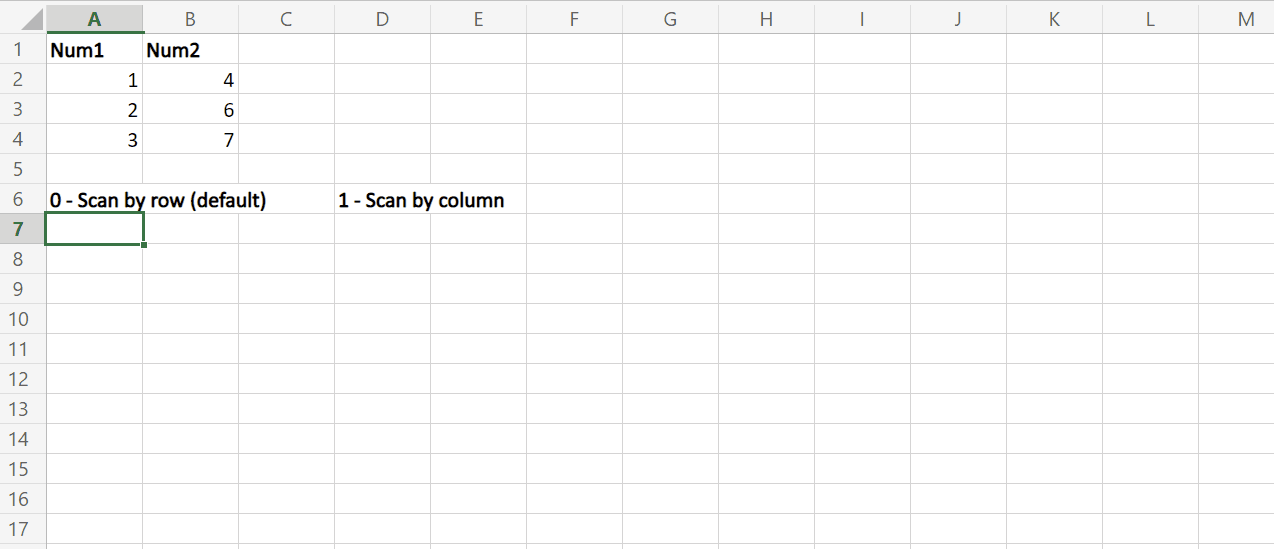 [scan_by_column] – Optional, use this to determine the order in which the array is scanned. The default is 0, which means – “scan by row”. If the value is set to 1, Excel will scan by column.