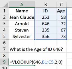 - table_array – This is where we perform our lookup. Our table starts at column B, as this is the column which contains our ID number. We can see that our table contains the Age column as well, as we would like to return the Age from it.