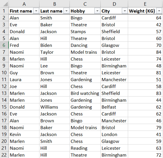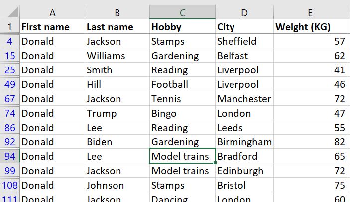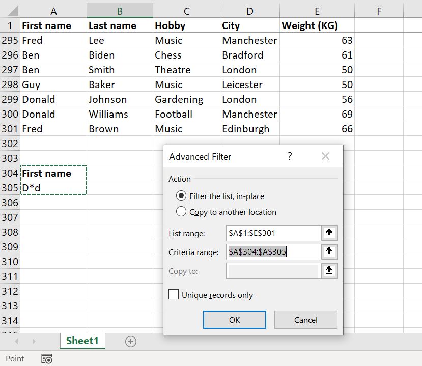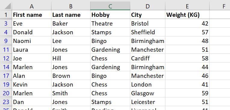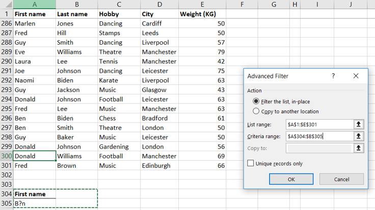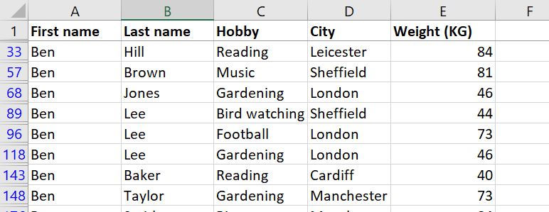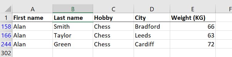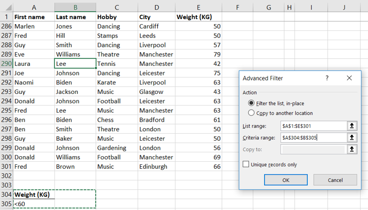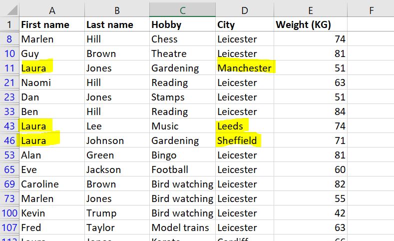 We asked the advanced Filter to show us all the people who are either named Laura OR live in Leicester (or both!). We did that by putting all the criteria in separate rows and using headers that match the original table.