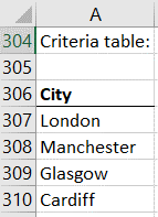 Important: For Advanced Filter to work, we have to give our new column the same header as in the table we are filtering, for our example that will be “City”: