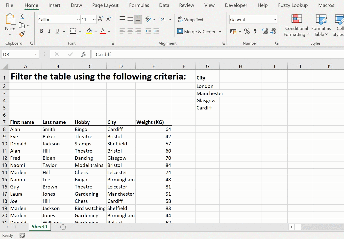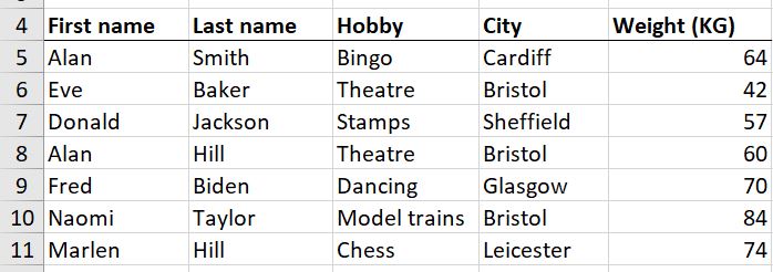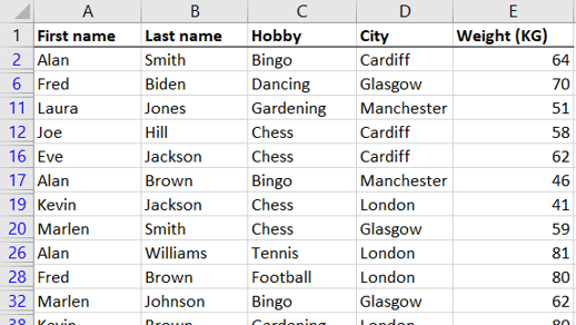 In the table below, we would like to filter for people who live in London, Manchester, Glasgow or Cardiff: