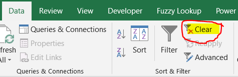 To un-filter, simply click on “Clear” in the “Data” Ribbon: