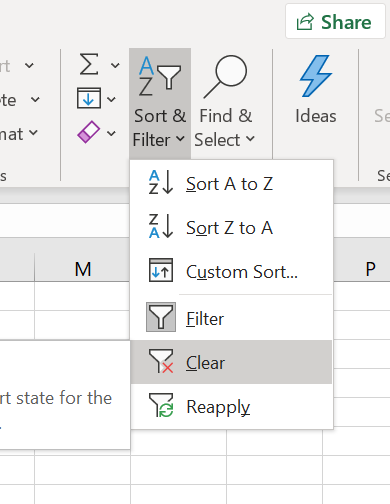 This method is useful when we have multiple filters applied and we want to quickly get rid of all filters in the worksheet. In the Home tab, click the Sort & Filter button, then select Clear: