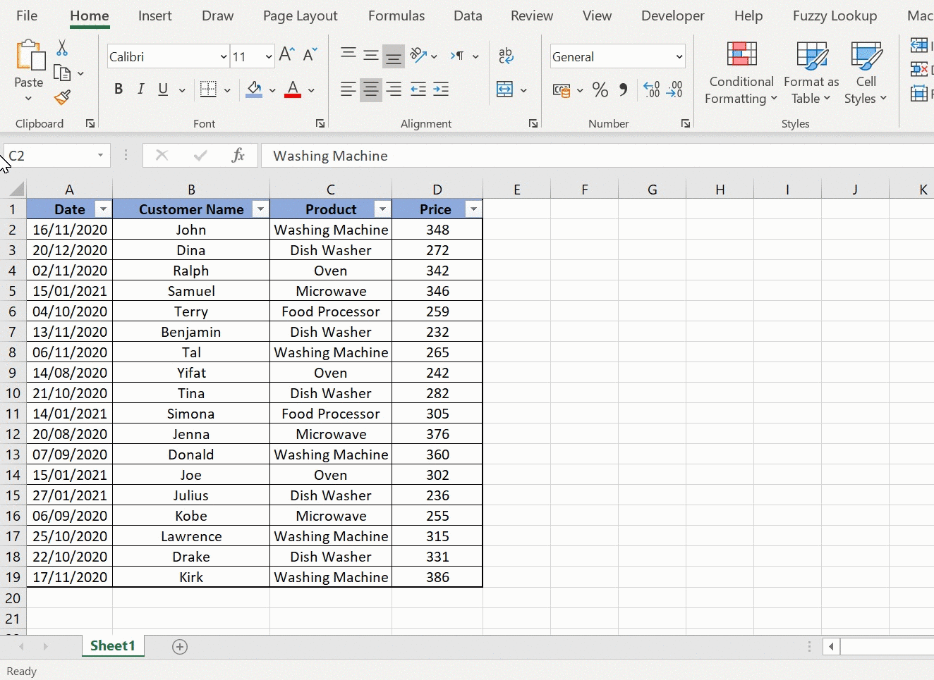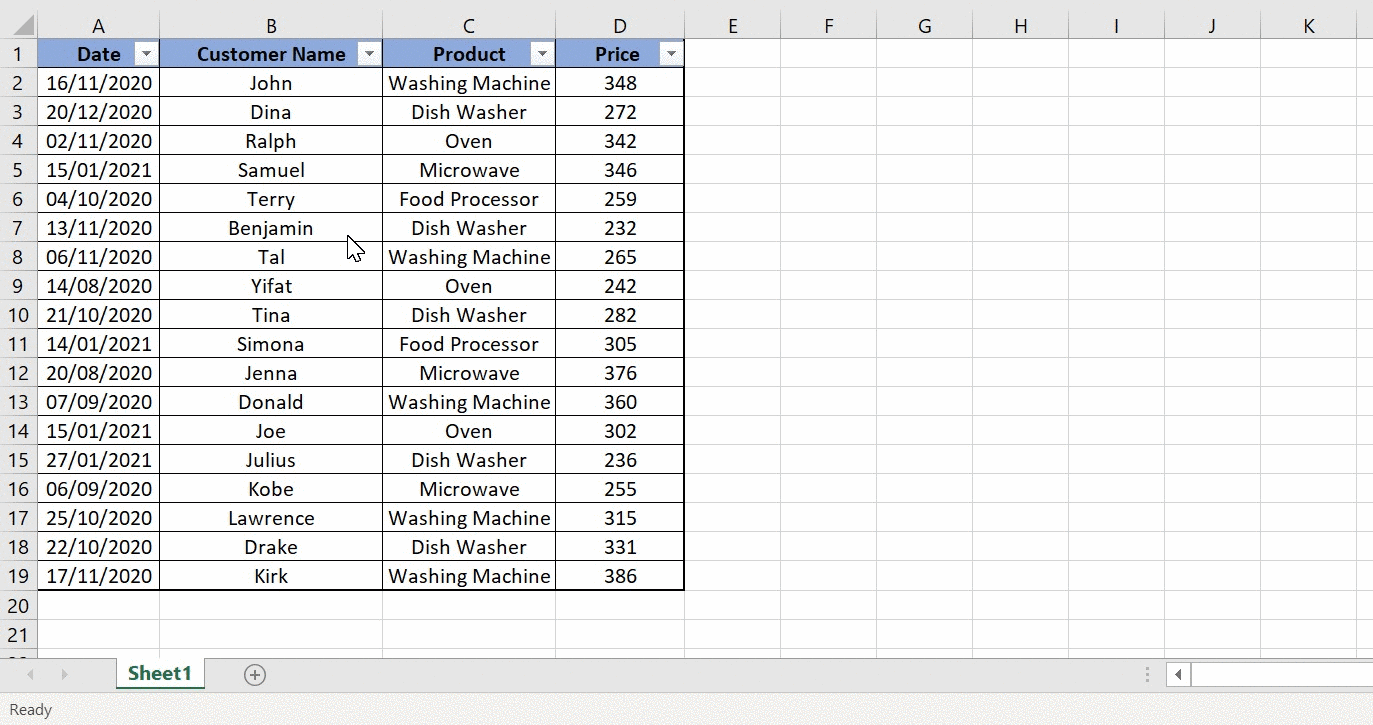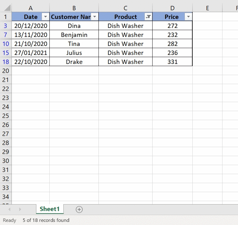 Now, let’s see how we can use the Filter tool to show us only items sold before October 15, 2020, and with a price lower than 300: