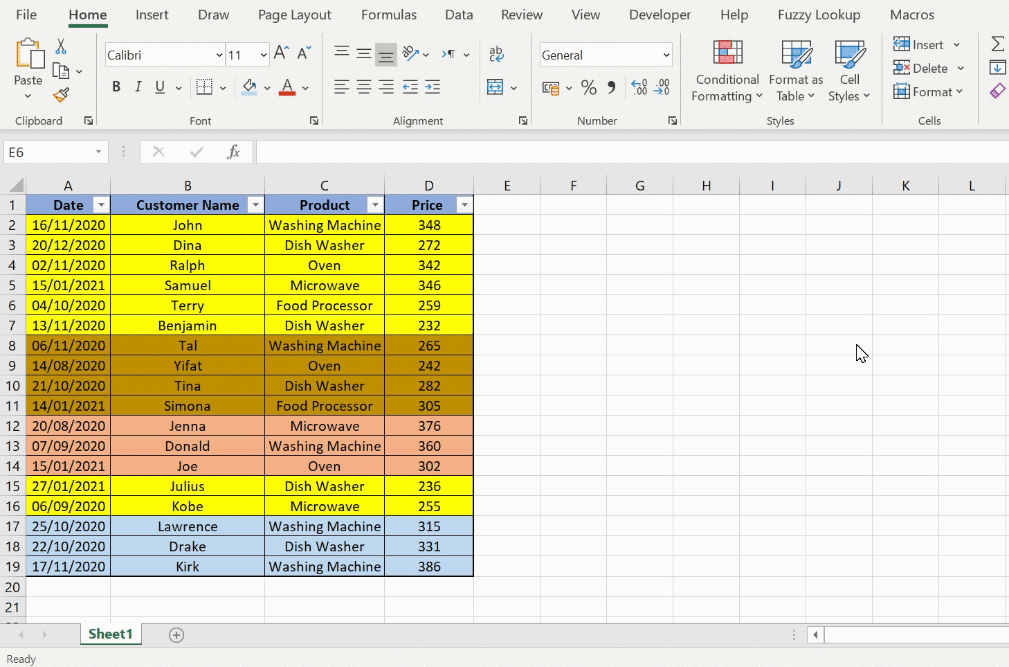 Let’s say we want to filter the following table to show only Yellow rows – Just Filter one of the columns, Select Filter by color, then select the desired color (Yellow):