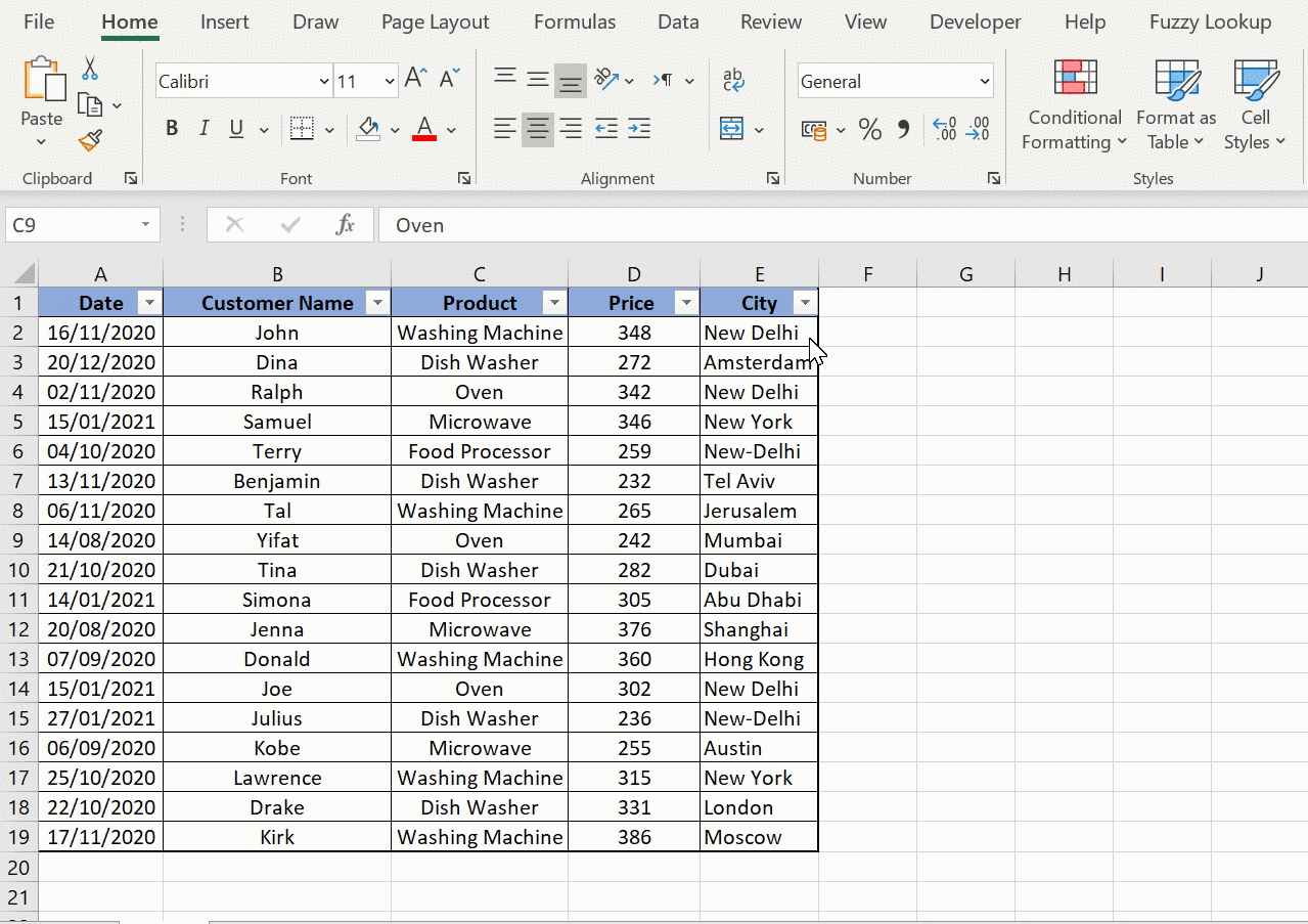 Let’s say we want to filter all the rows containing “New Delhi”. Did you notice that there are also certain rows with a dash between the “New” and “Delhi”? If we want to catch both types in one shot, we can use wildcards, and in this example, type: new?delhi. The ? question mark tells Excel to look for any single character, and it matches both the space character and the dash character!