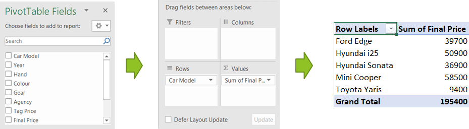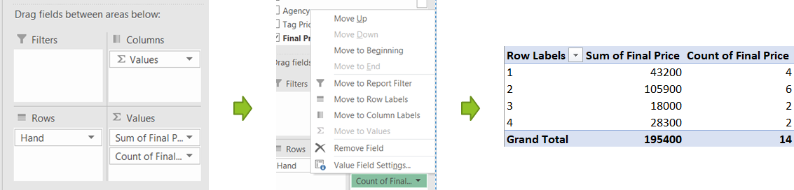In order to do so, we will drag the field which we would like to analyze into the “Rows” area or “Columns” if we would like to present the analysis in columns. We will the drag the field we want to sum into the “Values” area: