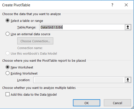 - Last, we will select “New Worksheet” to create the Pivot Table in a new worksheet, or “Exisiting Worksheet”, to place it in an existing worksheet.
