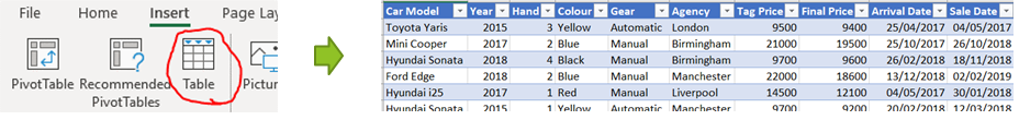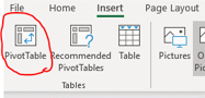 To create a new Pivot Table, we first need to select the data range which we would like to analyze, then click on one of the desired cells in our data range, then click Insert tab, then Pivot Table.