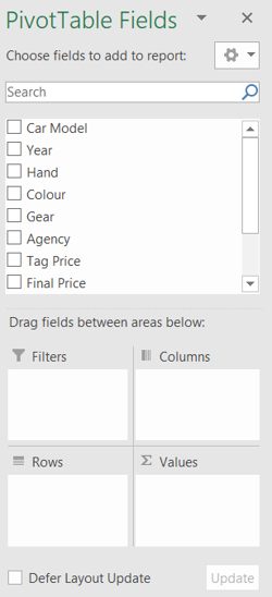 After we decided to create a Pivot Table, we can see all the column headers – these are the fields from our database which we can work with: