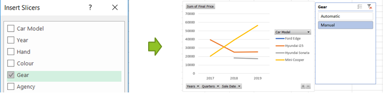 - We can add Slicers to our Pivot Table / Chart, which will enable visually filtering the field, by clicking on the “Analyze” tab and then on “Insert Slicer”. Here’s how it looks: