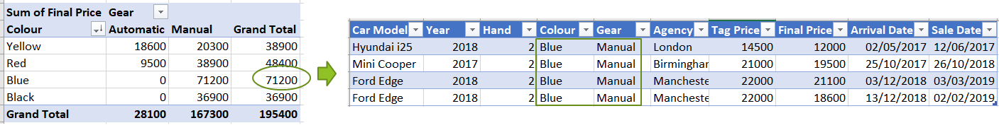 Whenever we like, we can present all the items that are calculated in a certain cell in the Pivot Table by double-clicking that cell. This will result in a new sheet opening: