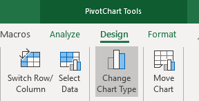 Like any other chart, we can control the axis’ directions and the chart type by clicking on the “Design” tab. We can, for example, replace the X and Y axis by “Switch Row/Column” in the “Design tab”. We can also change the Chart type: