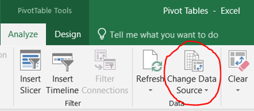 If we want to add new data to our Pivot Table that will be added at the end of the previously used data range, we need to update the source data’s range by clicking on “Change Data Source” in the “Data” group: