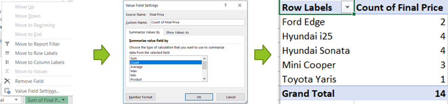 We can change the calculation by clicking the field after we dragged it into the “Values” area, then “Value Field Settings…”, which will open a menu where we can choose to sum, count, average and many more calculations: