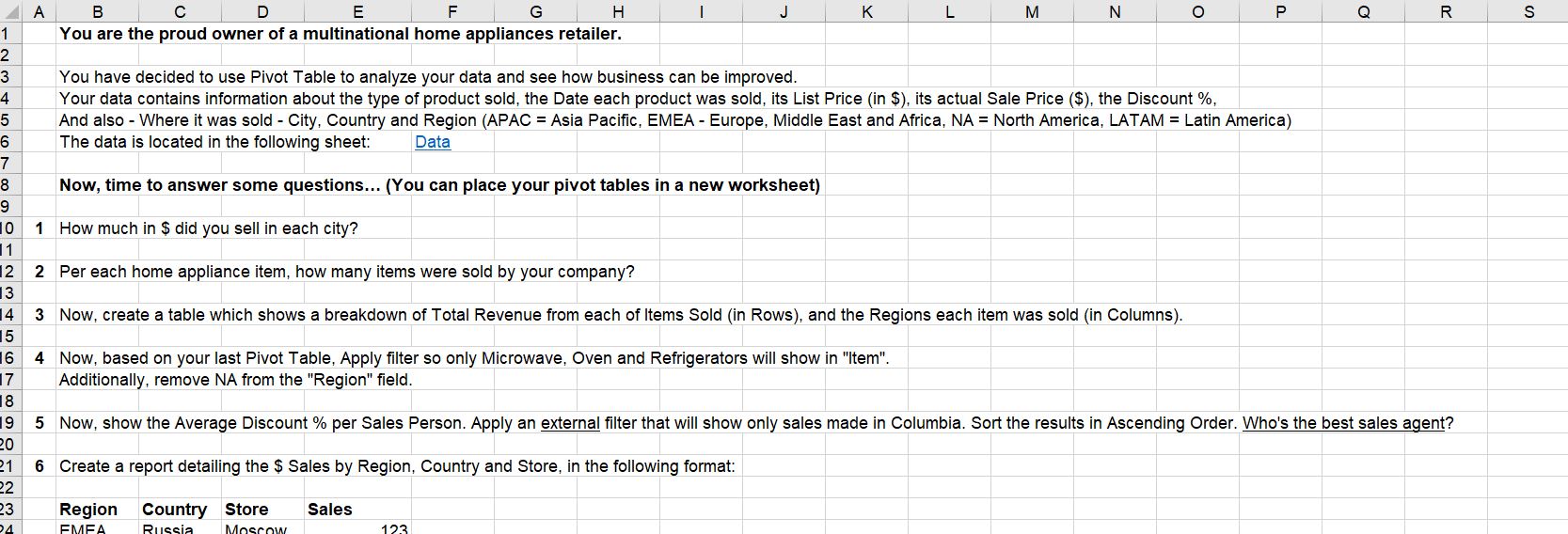 We can use a Pivot Table to perform calculations on our data based on certain criteria. For example – Sales per Store, Sales per Year, Average Discount per Region, and many more…