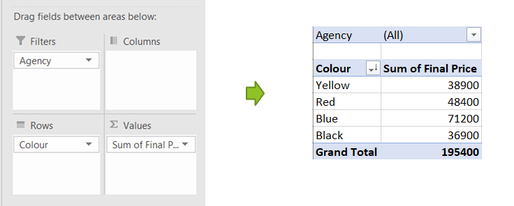 One of the most basic examples of using a Pivot Table is summing values of a specific field based on a criteria that appears in a different field.