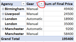 We can filter data shown in the Pivot Table rows simply by clicking the corresponding button in the desired field. For example, to filter the “Gear” field, we simply have to click the button next to the field name: