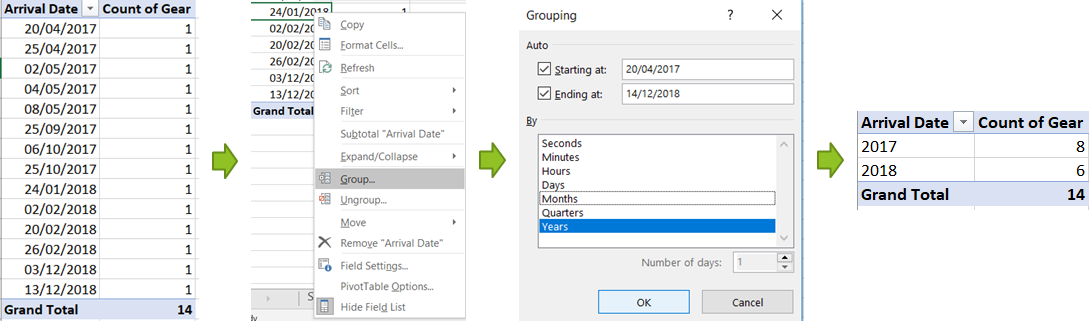 We can group data presented in the Pivot Table’s rows and columns with “Group” and reverse it with “Ungroup” by right-clicking one of the cells: