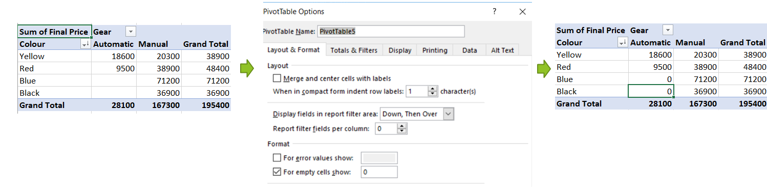 We can control the way missing values (empty cells) or errors are presented in the Pivot Table by right-clicking one of the cells and clicking on “Pivot Table Options”, then ticking “For error values shows” or “For empty cells show” (as shown in the following example)