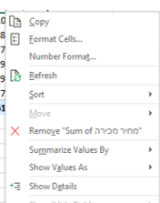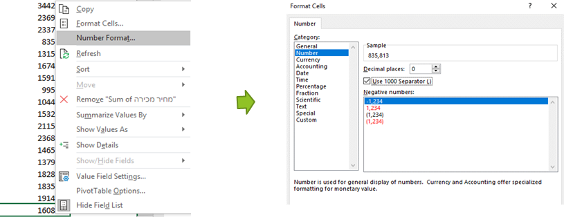 We can quickly select the way we wish to format a certain value field, by right-clicking the field and then clicking on “Format Cells”, or directly on “Number Format”, if we wish to format the values as number and add 1000 separator (4,524,254 instead of 4524254):