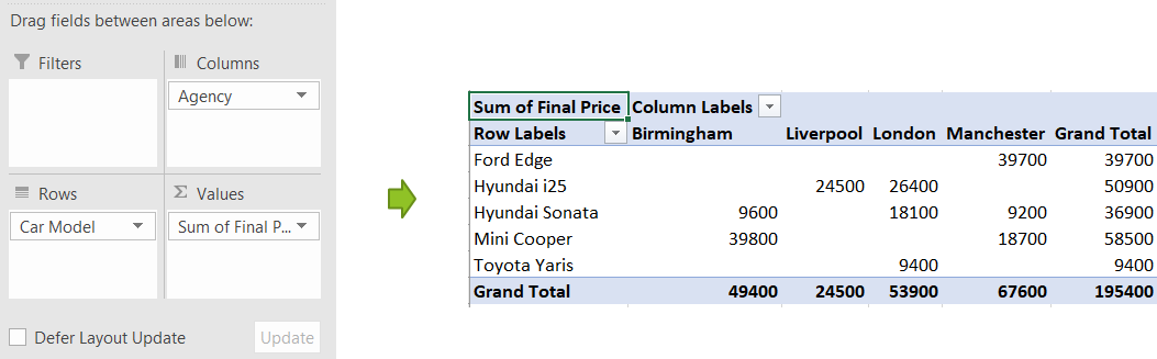 To start creating our Pivot Table, we can drag the different fields to the following areas: