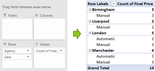 In the Pivot Table, we can segment based on more than one field by dragging several fields into the “Rows” area: