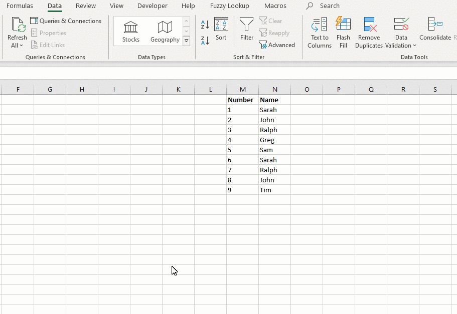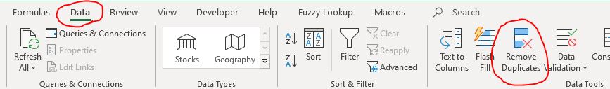 We can access the Remove Duplicates tool by first selecting the desired range for duplicates removal, then navigating to the Data ribbon in Excel, and then clicking Remove Duplicates. See more on how to identify and remove duplicates here.