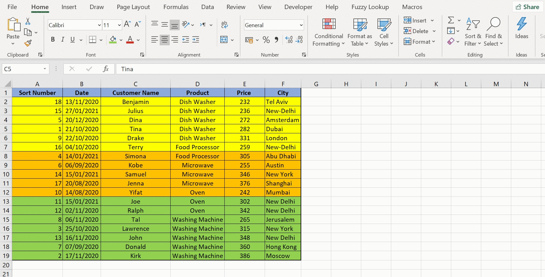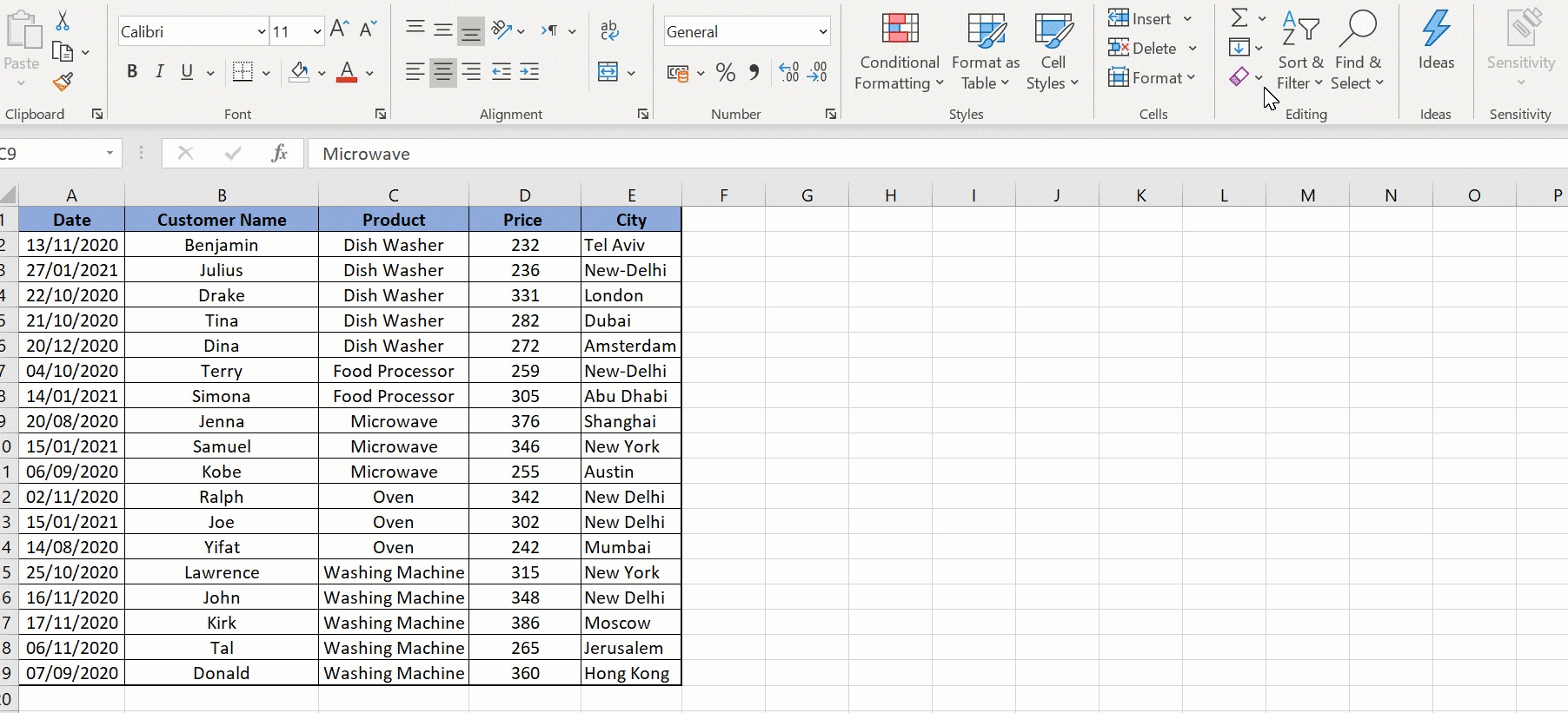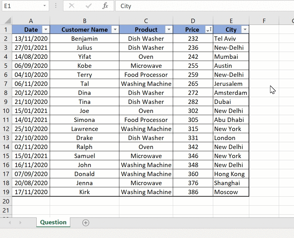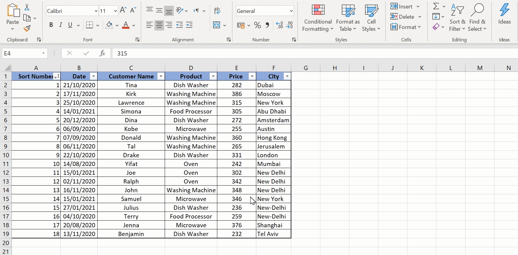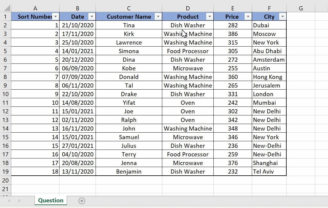 Sometimes we may want to sort our data by more than one criteria. For example – First you sort by Product A-Z, then sort by Price in Ascending Order. We can do it using Custom Sort, which can be used from the Sort & Filter button:
