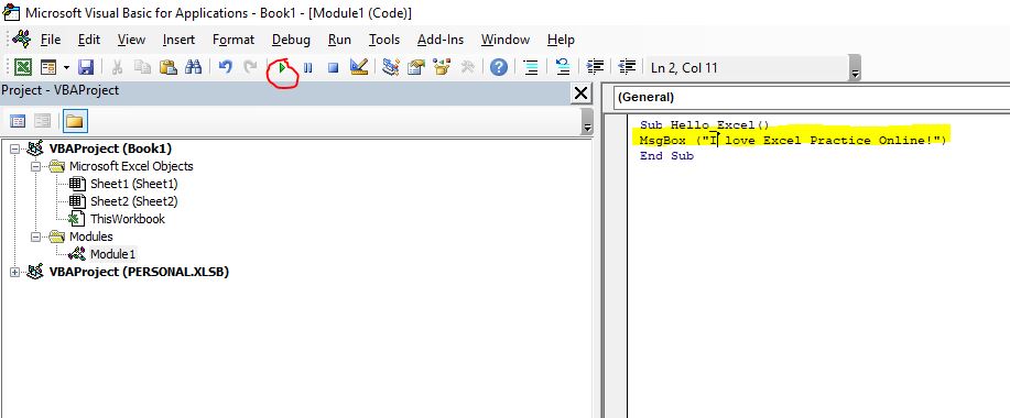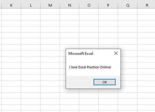 Between the first and last line, you can see the MsgBox command – This will show a message box (MsgBox) with the message “I love Excel Practice Online” π